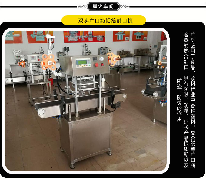 廣泛應用于食品、飲料行業中各種塑料、復合紙等廣口瓶容器的熱合封口,具有防潮、防漏、延長產品保質期以及防盜、防偽的作用
